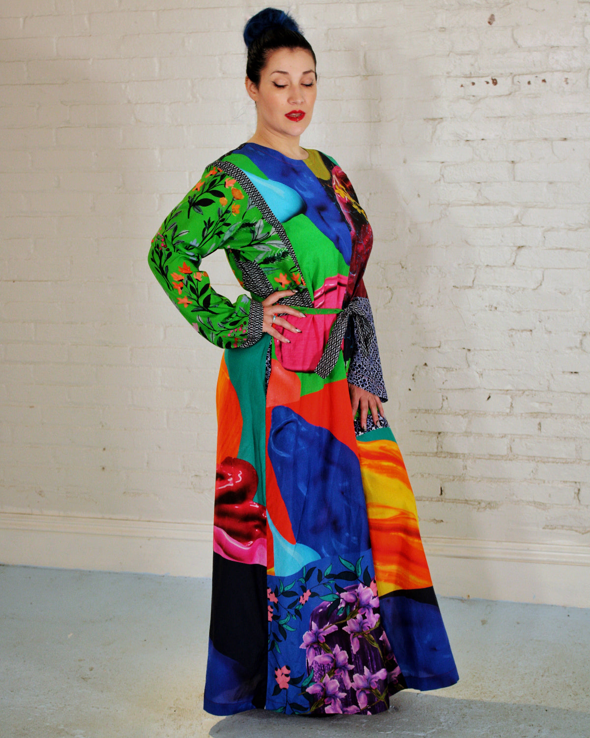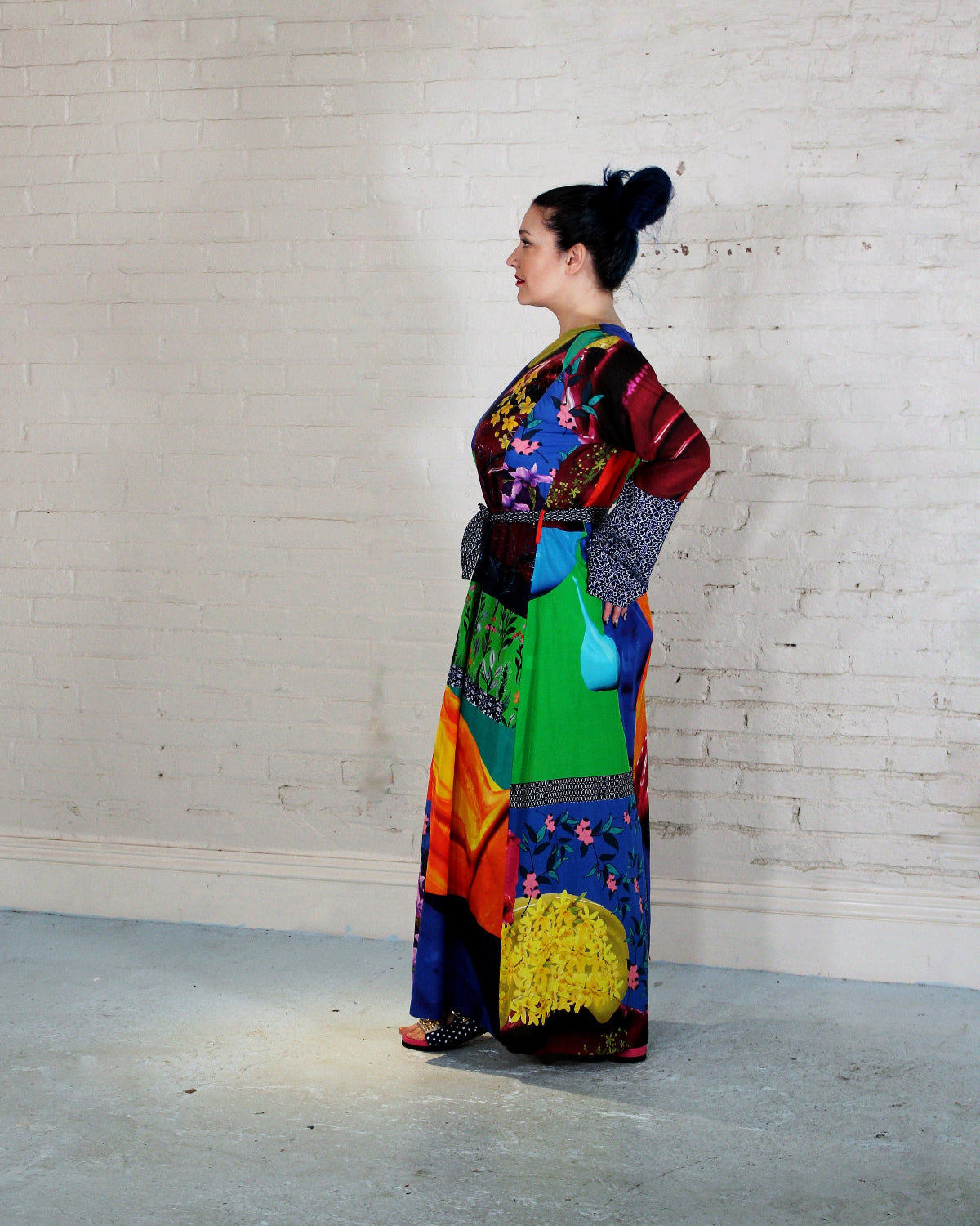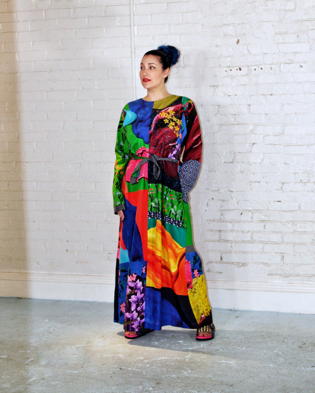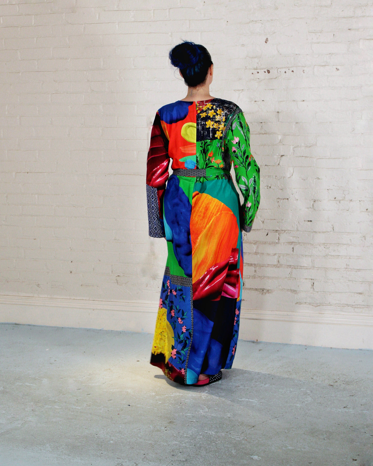 Inspired by classic kimono lines, this dress features vibrant colors and designs while providing both structure and fluidity. Equally suited for everyday elegance or dressed-up occasions, it's a timeless piece with joyful ease.