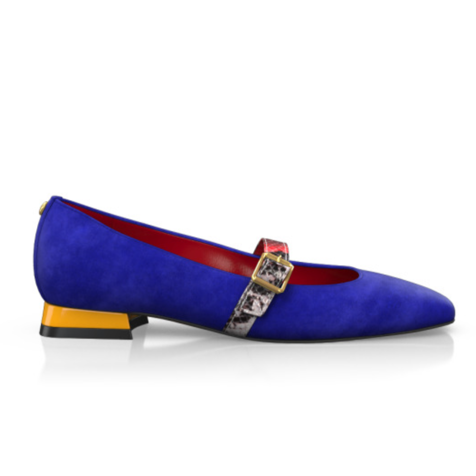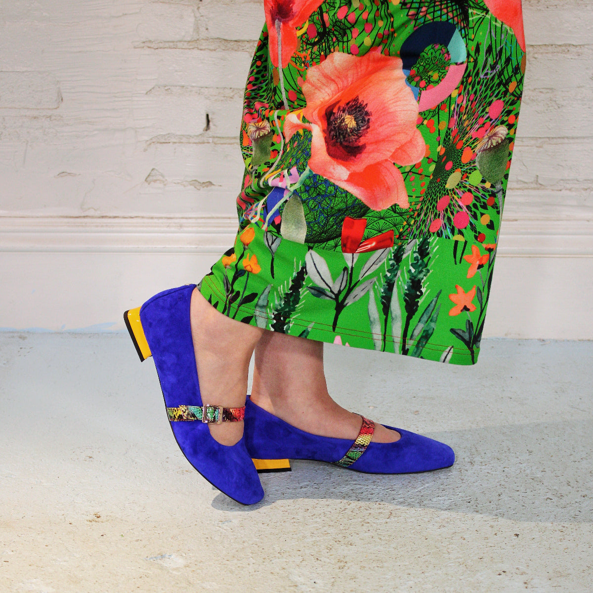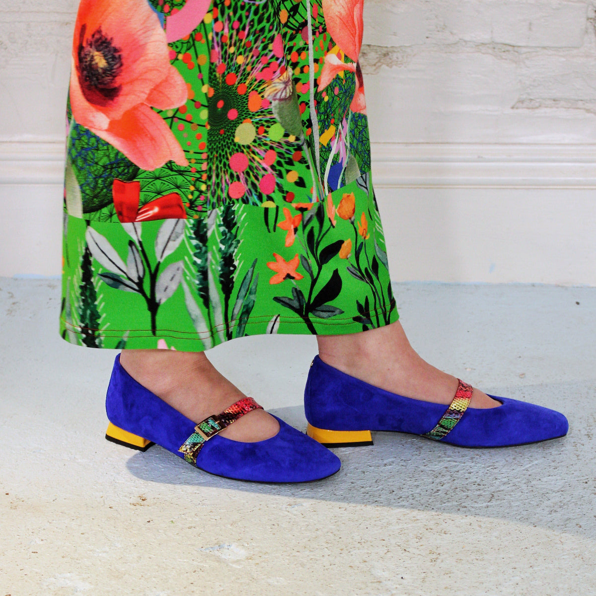 Bold and stylish bright blue flats, featuring an animal print strap and genuine Italian soft leather. Perfect for pairing with any outfit.