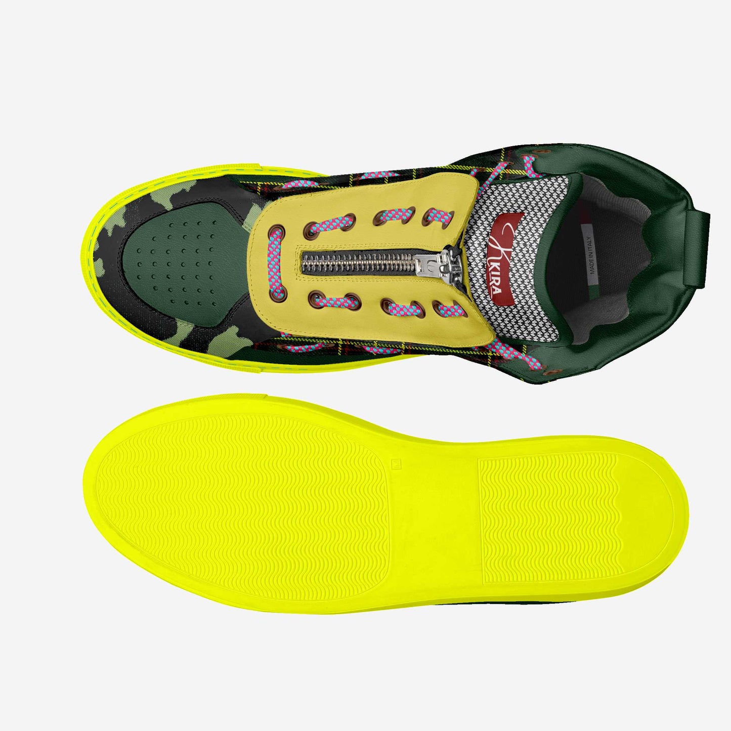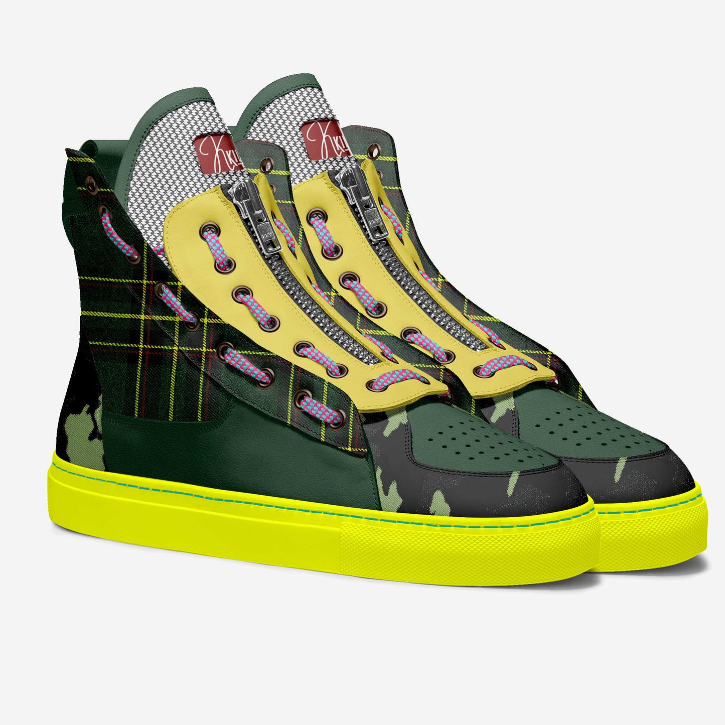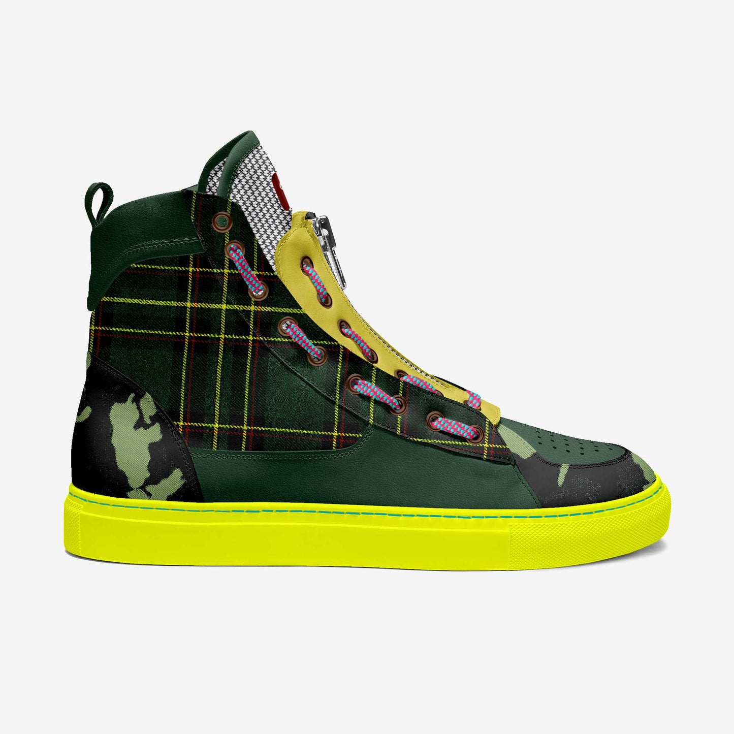 This high top unisex sneaker is a unique mix of camo green with a bold yellow that stands out in any crowd. The yellow sole and unique patterned shoe laces with a zipper feature tie it together to bring life into any outfit. Total Comfort, Funk, and Fun!