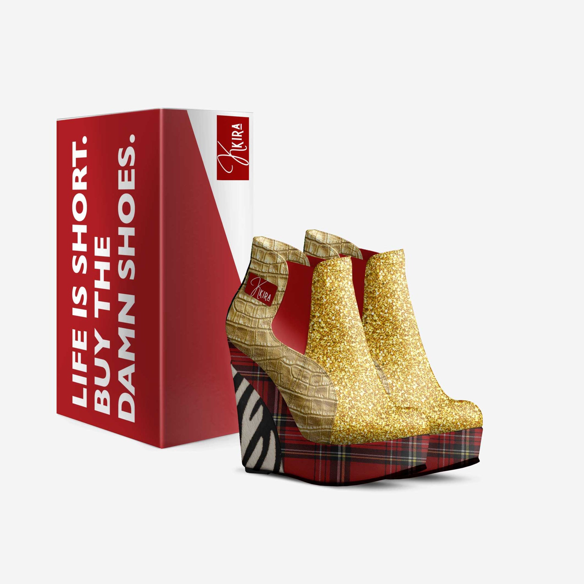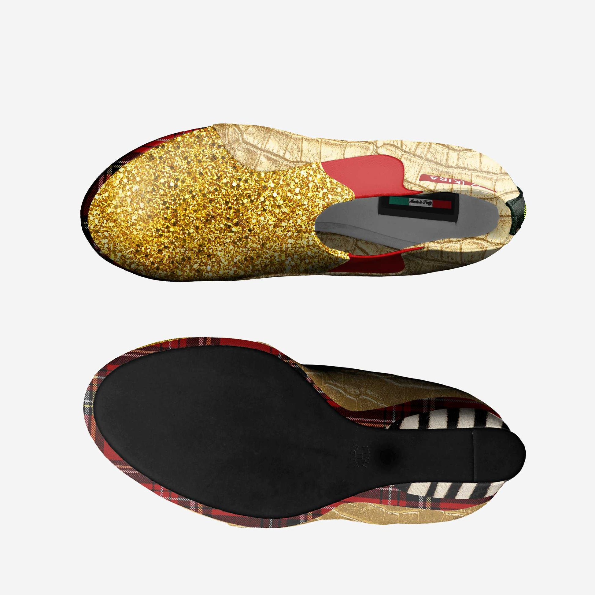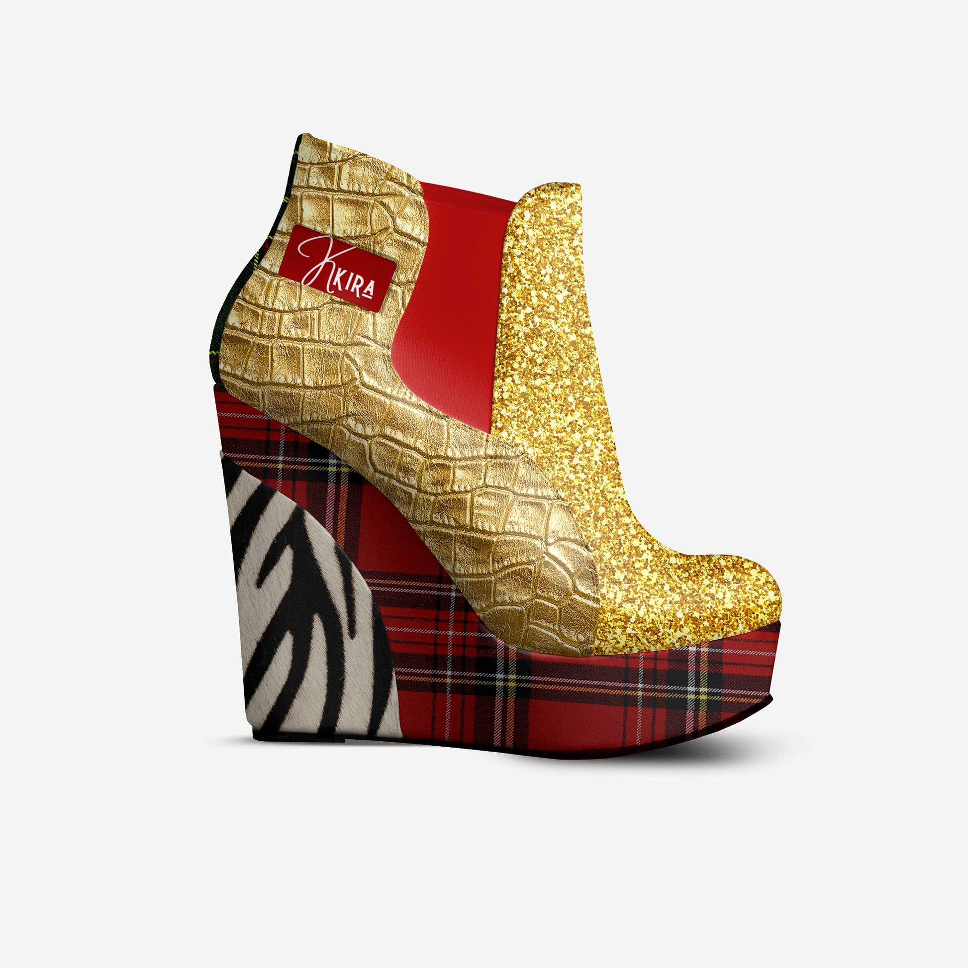 This wedged heel shoe provides a bold, holiday look that is sure to impress. It features mixed patterns on the wedged heel with bold blocks of gold on the boot. Definitely the kind of boots to stand out and put you in a festive mood!
