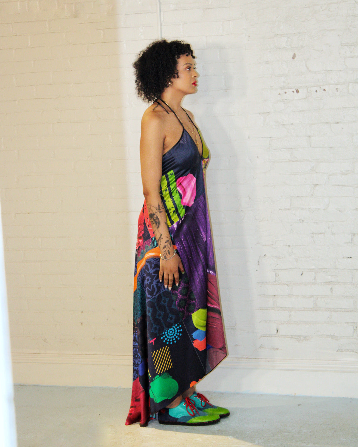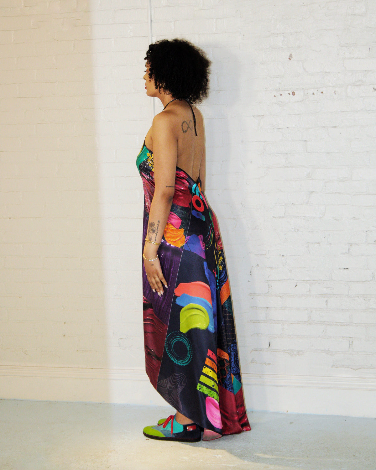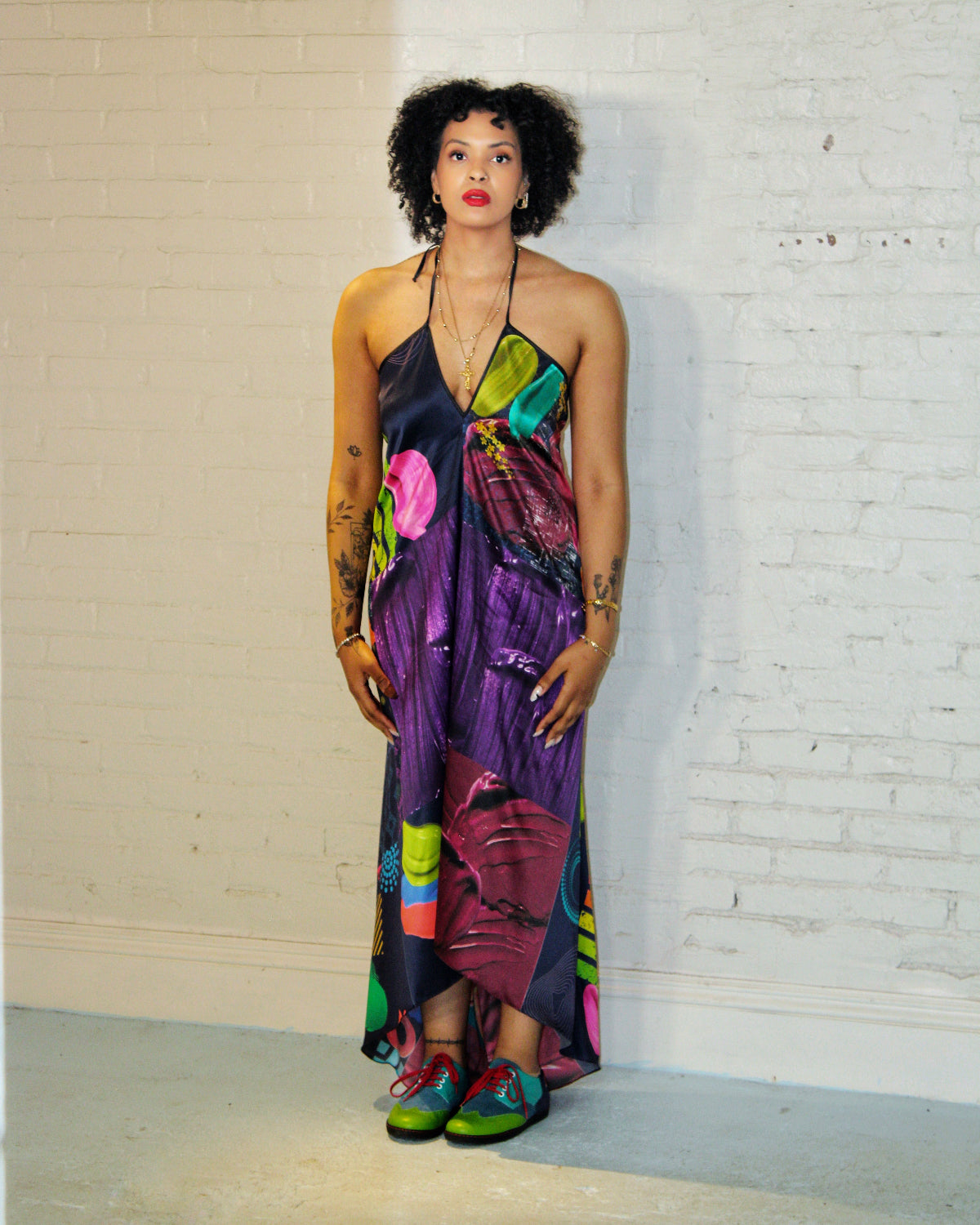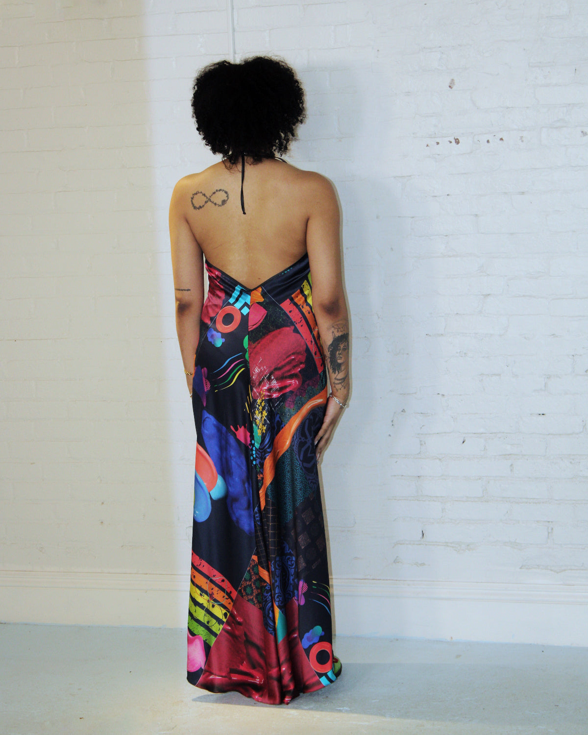 Embrace an elegant look in our Rainbow Kaleidoscope Halter Maxi dress. With an open back and a train for a slinkier look, the piece is designed to, inspire every bit of fierceness you embody while flattering your every curve.