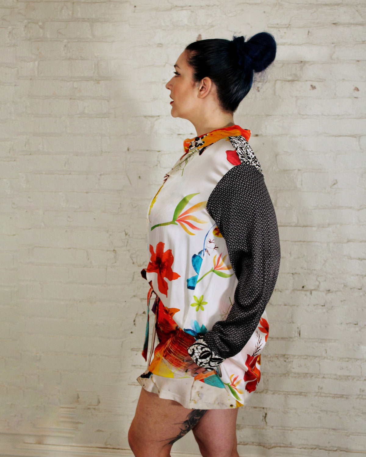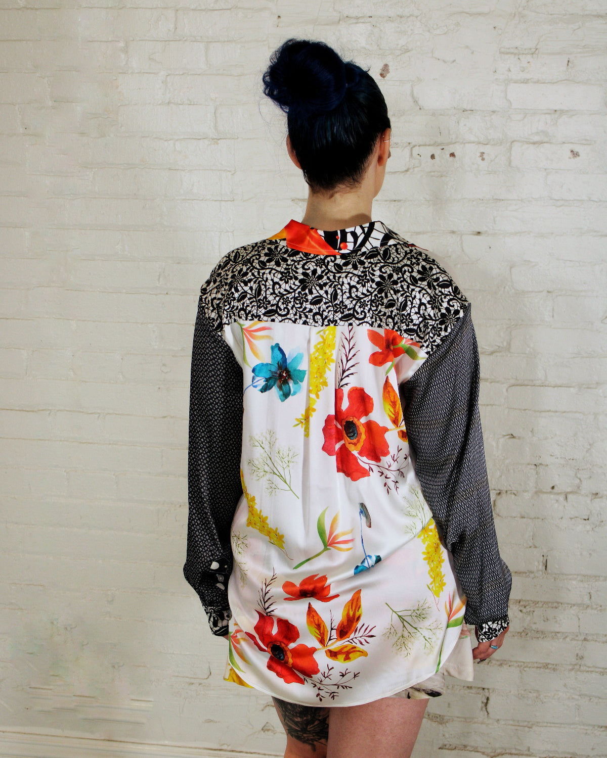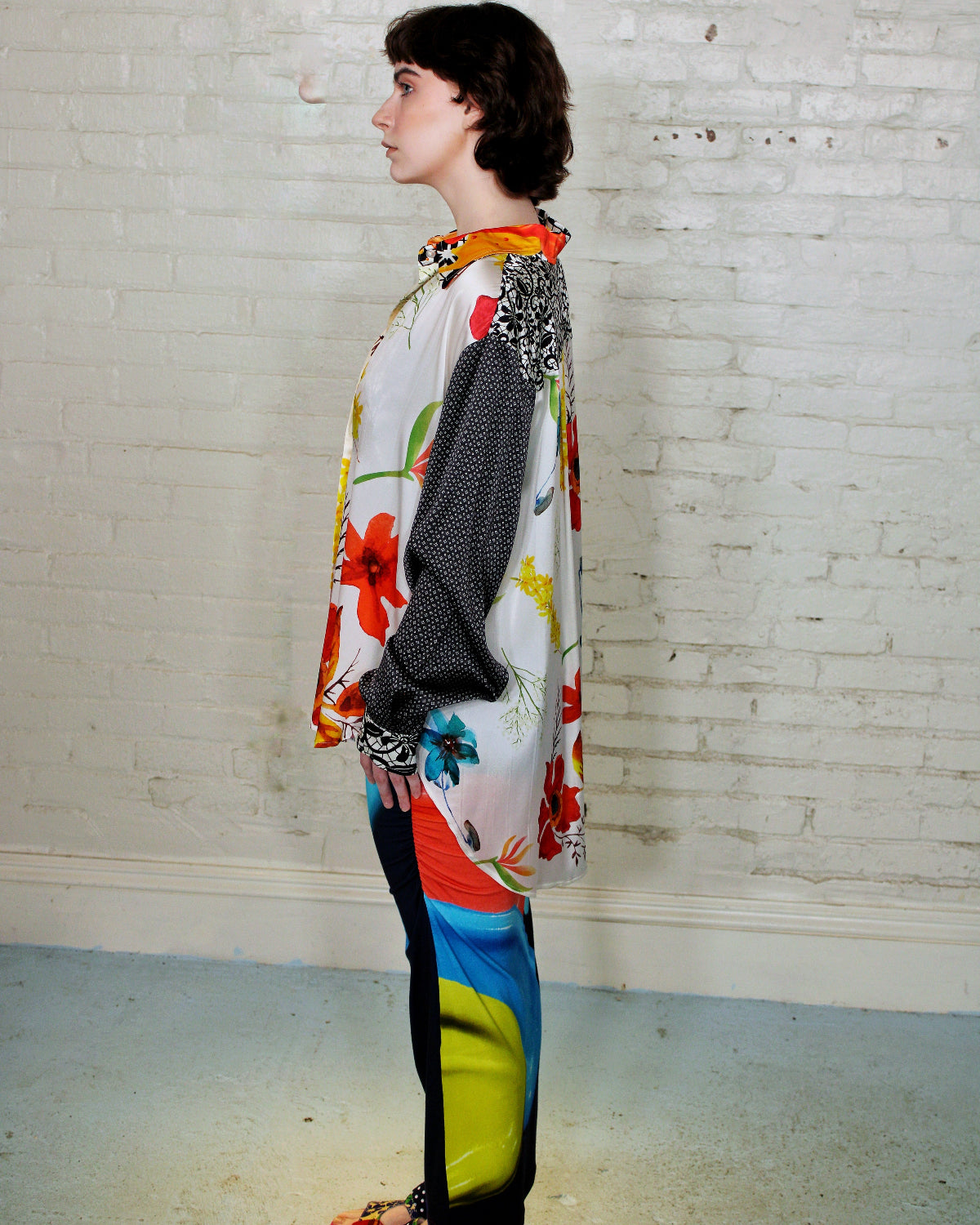 Our White Floral Bliss Oversized Shirt brings together timeless elegance and bold expression. This shirt features a colorful floral print on silk charmeuse fabric, providing smooth draping with a vibrant high gloss finish. Perfect to pair with tailored trousers or your everyday denim.